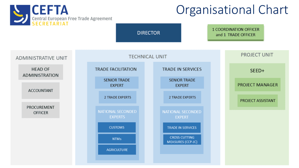The CEFTA Secretariat has been established by the CEFTA Parties in 2008, in line with Article 40.2 of the CEFTA Agreement. The key role of the Secretariat is to provide technical and administrative support to the Parties in implementing the CEFTA Agreement and its legal documents. It also provides support to Joint Committee and other CEFTA bodies in developing policies and procedures in the trade related areas. The mandate of the Secretariat is set out in Joint Committee Decision 1/2018.
